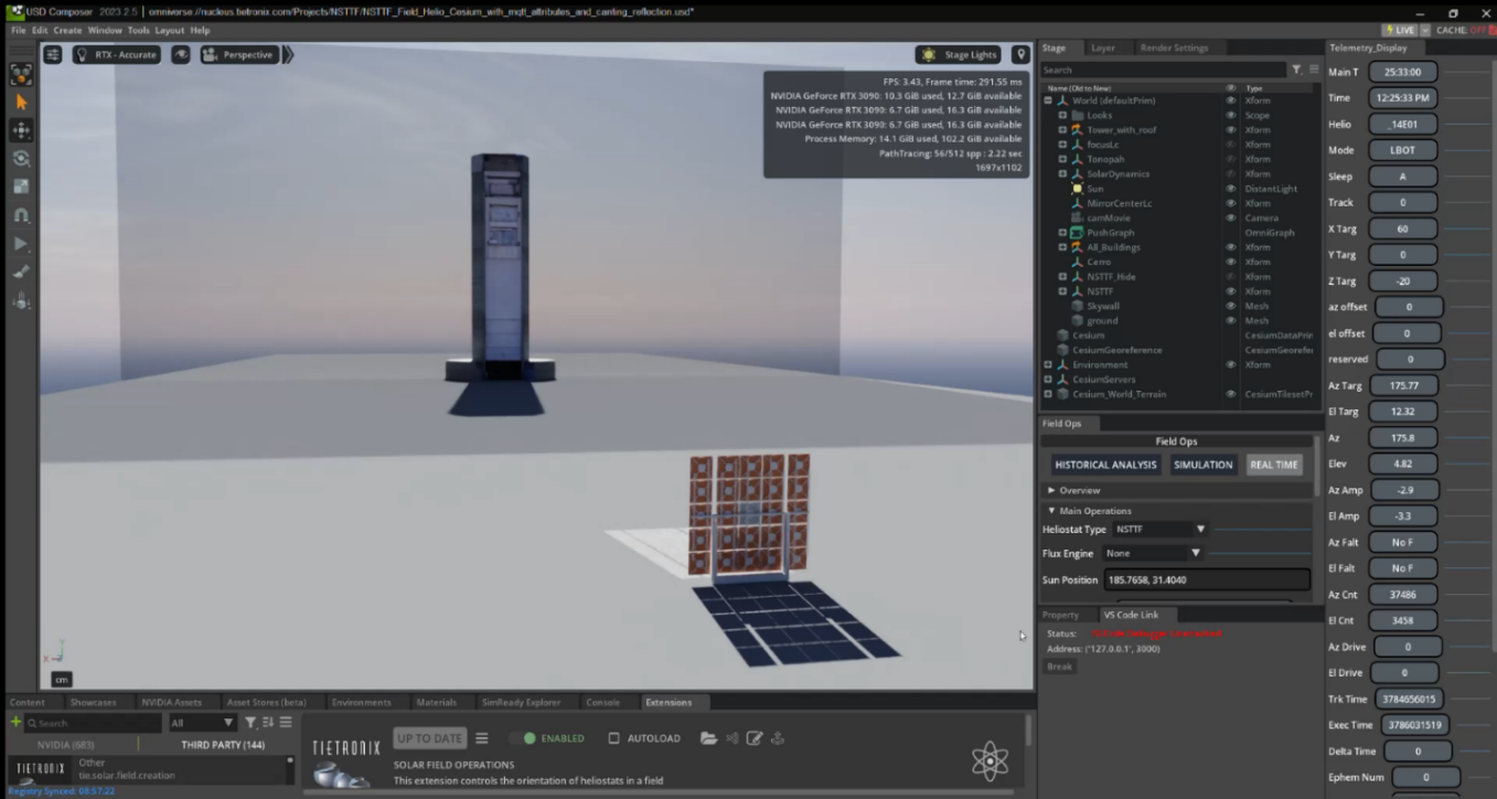 Figure 11. Digital twin of one heliostat at the NSTTF, playing back the log file of an experiment operation. The digital twin provides visualization of the heliostat motion and displays the telemetry data captured during the experiment.