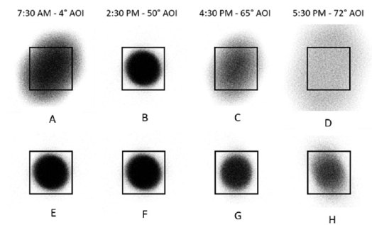 Figure 10. Top row shows a typical sun disc image of heliostats that don’t change shape. Bottom row shows the sun disc image using this shape-changing heliostat at four different times during a day.
